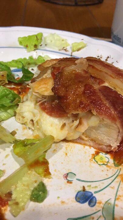 No olvides poner peperoni sobre la pechuga al envolver. 325f en el horno por 15 – 20 minutos. Servir sobre una pasta de tomate. Yo utilicé de mi pasta que utilizó cuando preparo pizza.