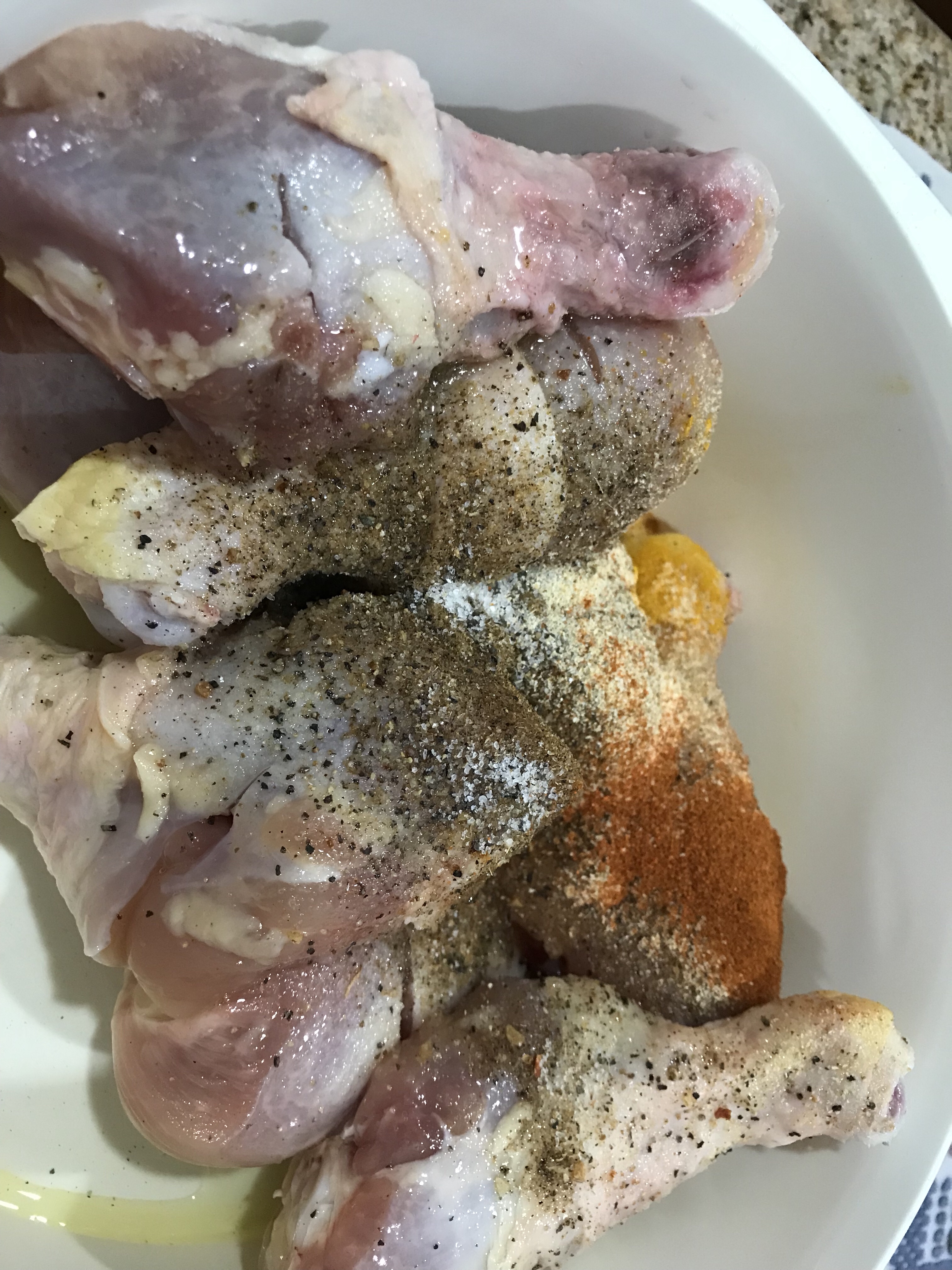 El primer paso es sazonar a tu gusto, esta vez experimente con cúrcuma, chile Cheyenne, sal, pimienta y cúrcuma, además de especias mixtas. Le pones un poco de aceite de oliva para que se mezcle bien y será la forma en que tu harina se le pegue a el pollo.