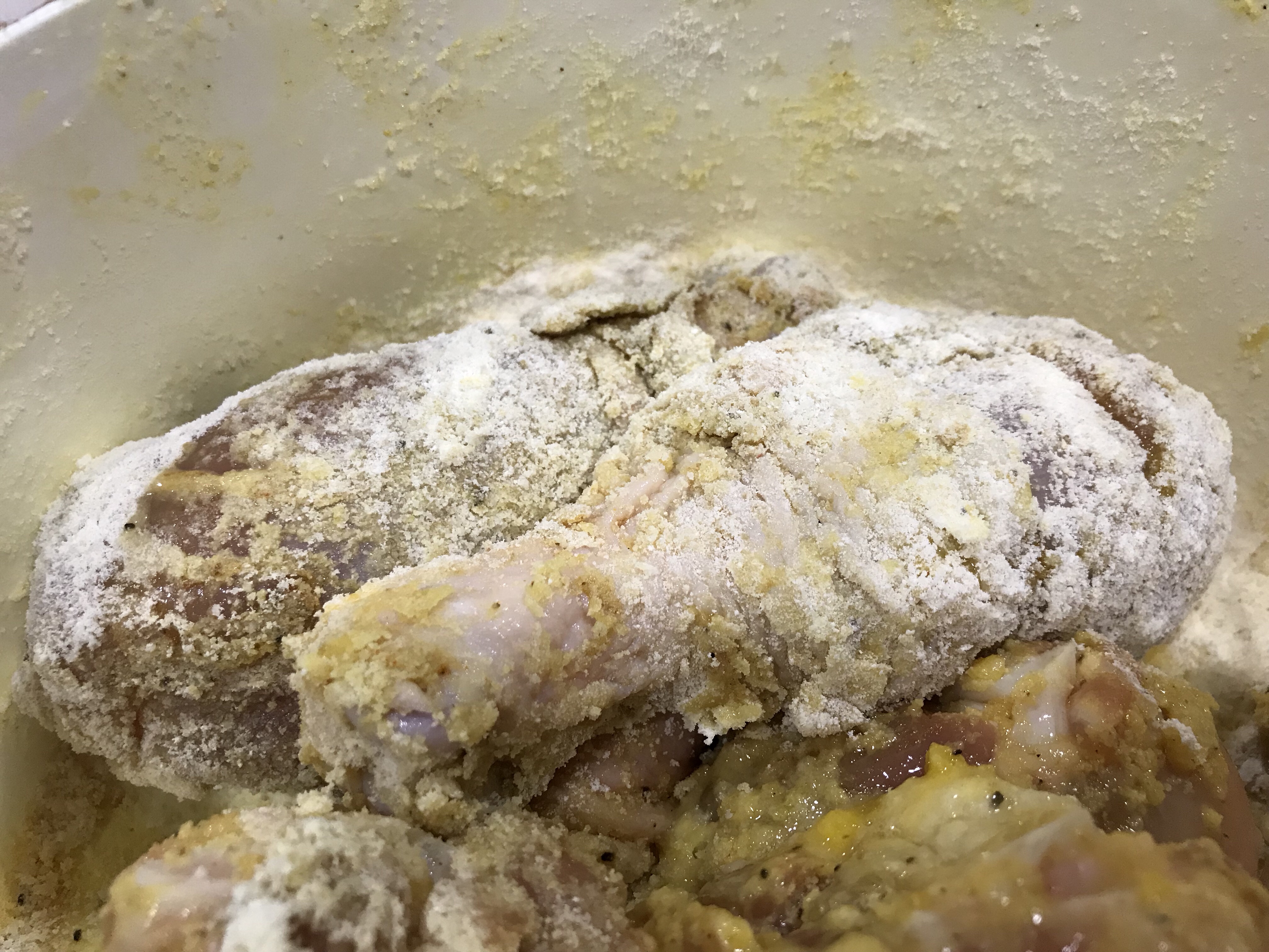 Puedes ver un poco como el huevo y la harina no me funciono, así que rescate la mayoría y solo pase mis piernas por la mezcla de harina.