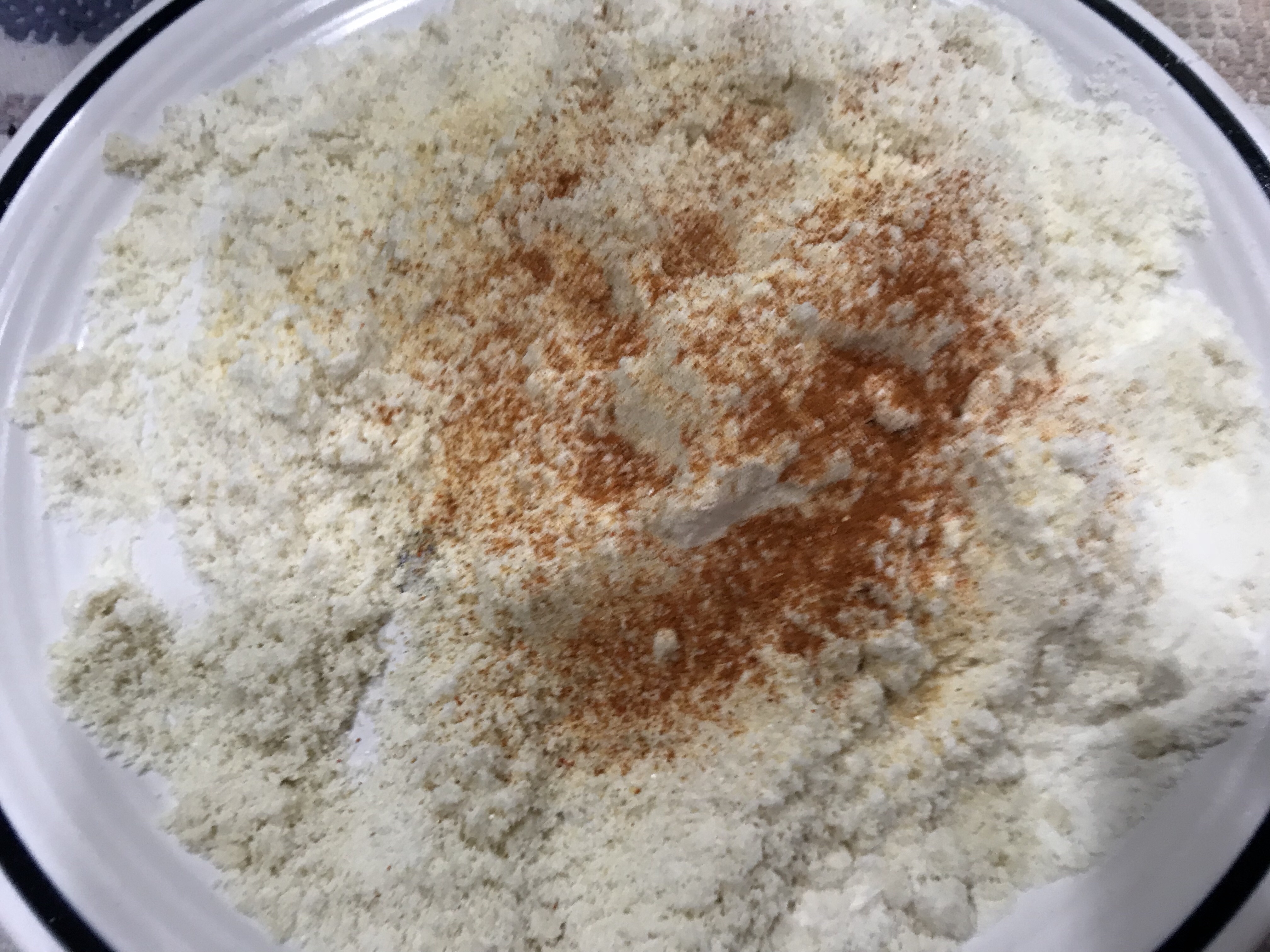 Sazonar la mescla de 1 taza de harina de almendras y 1 taza de proteína Lowcarb sin sabor, un poco de chile en polvo, sal y pimienta, ajo en polvo.