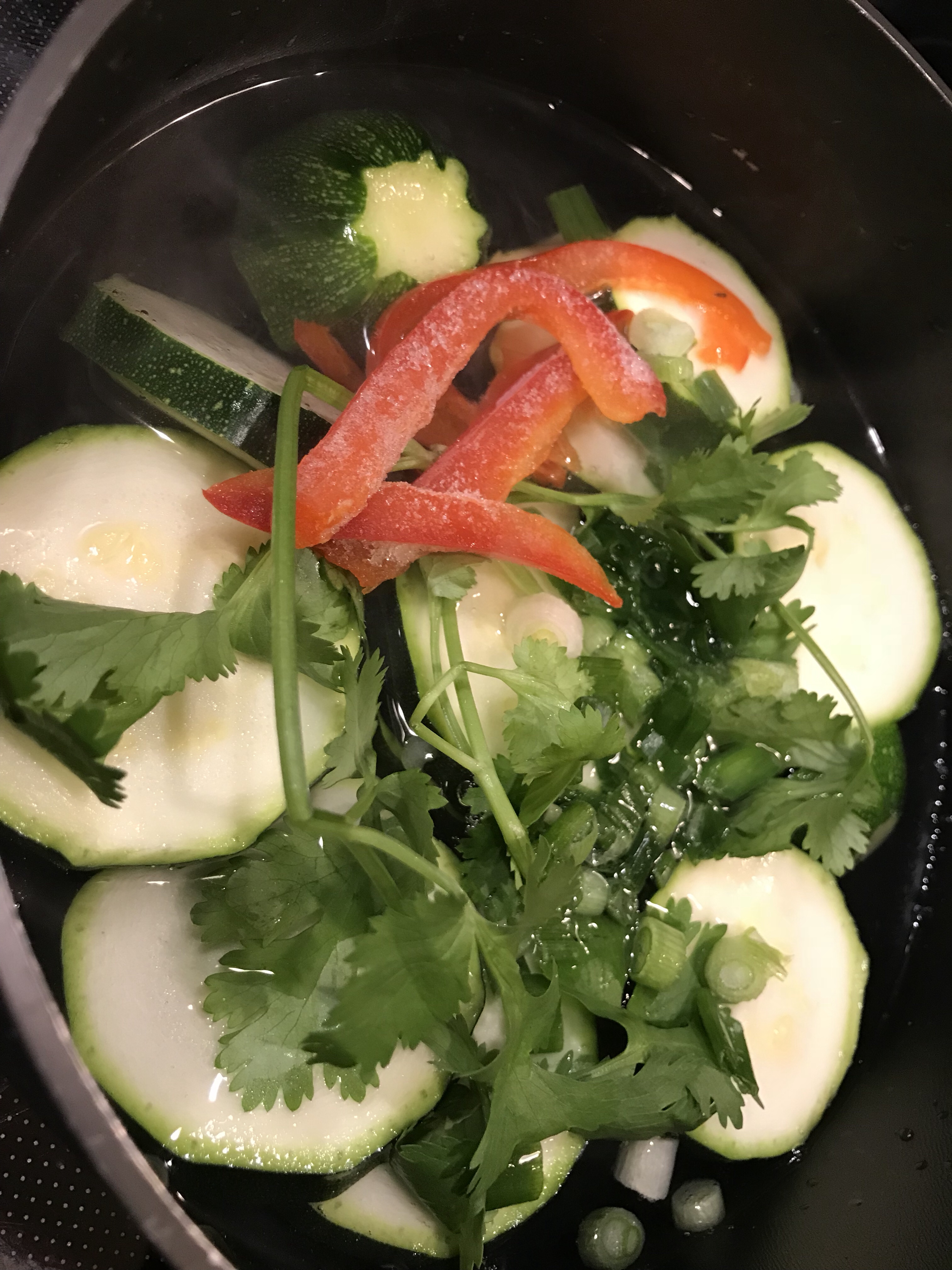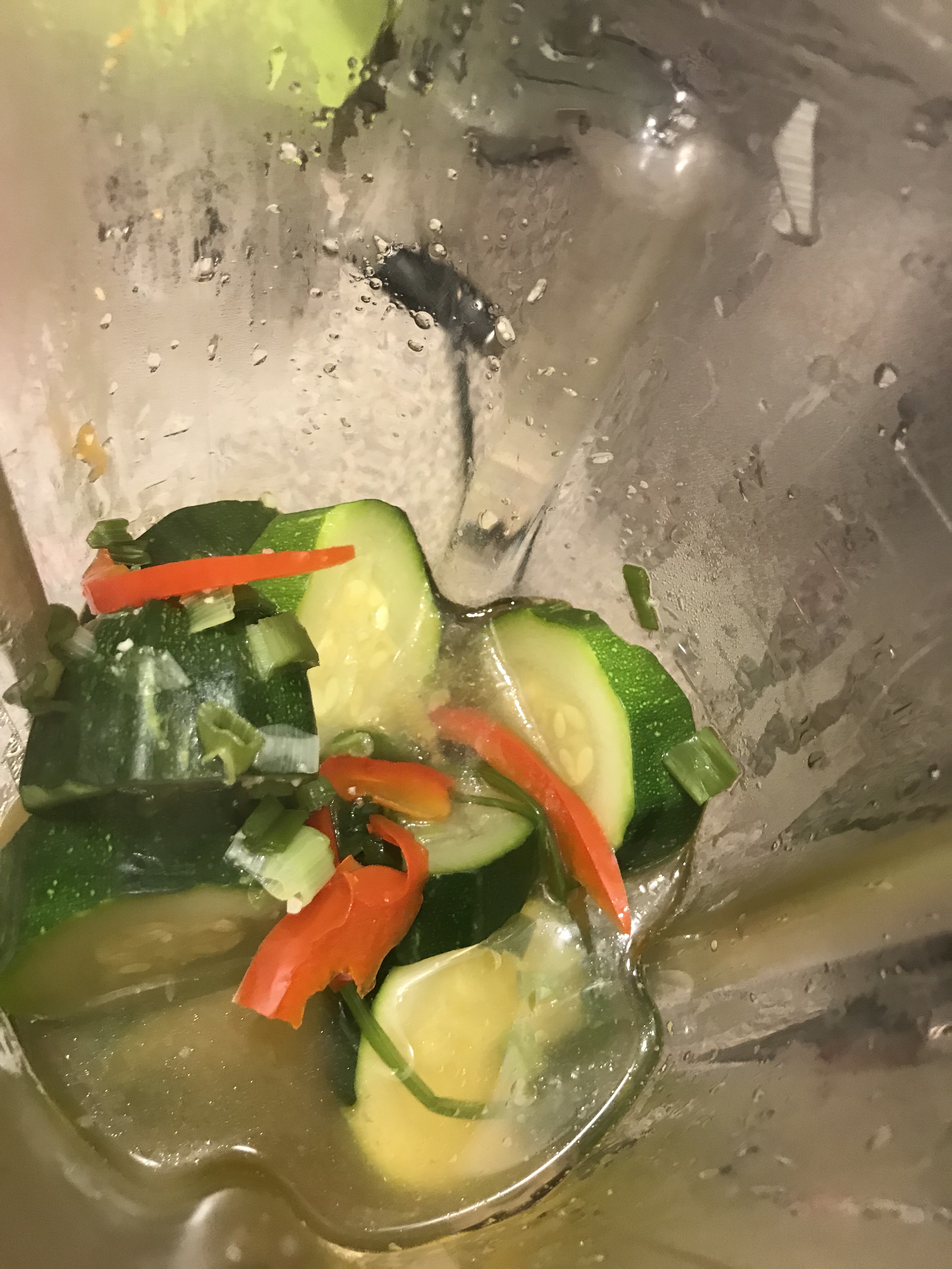 Colocar todos los vegetales en la licuadora, y yo use caldo de pollo que tenia hecho porque le da un sabor a la sopa, pero pueden usar la misma agua donde lo cocinaron