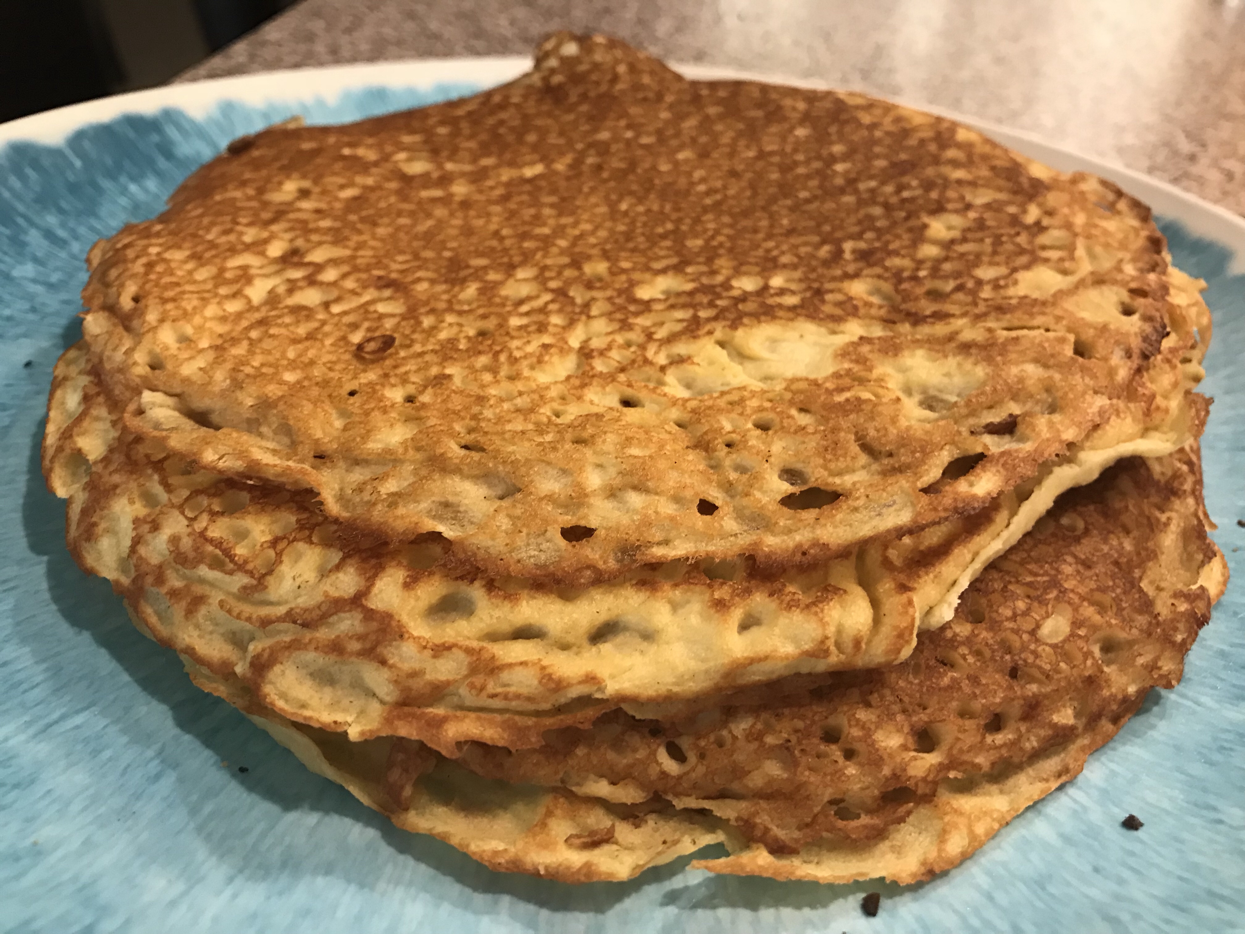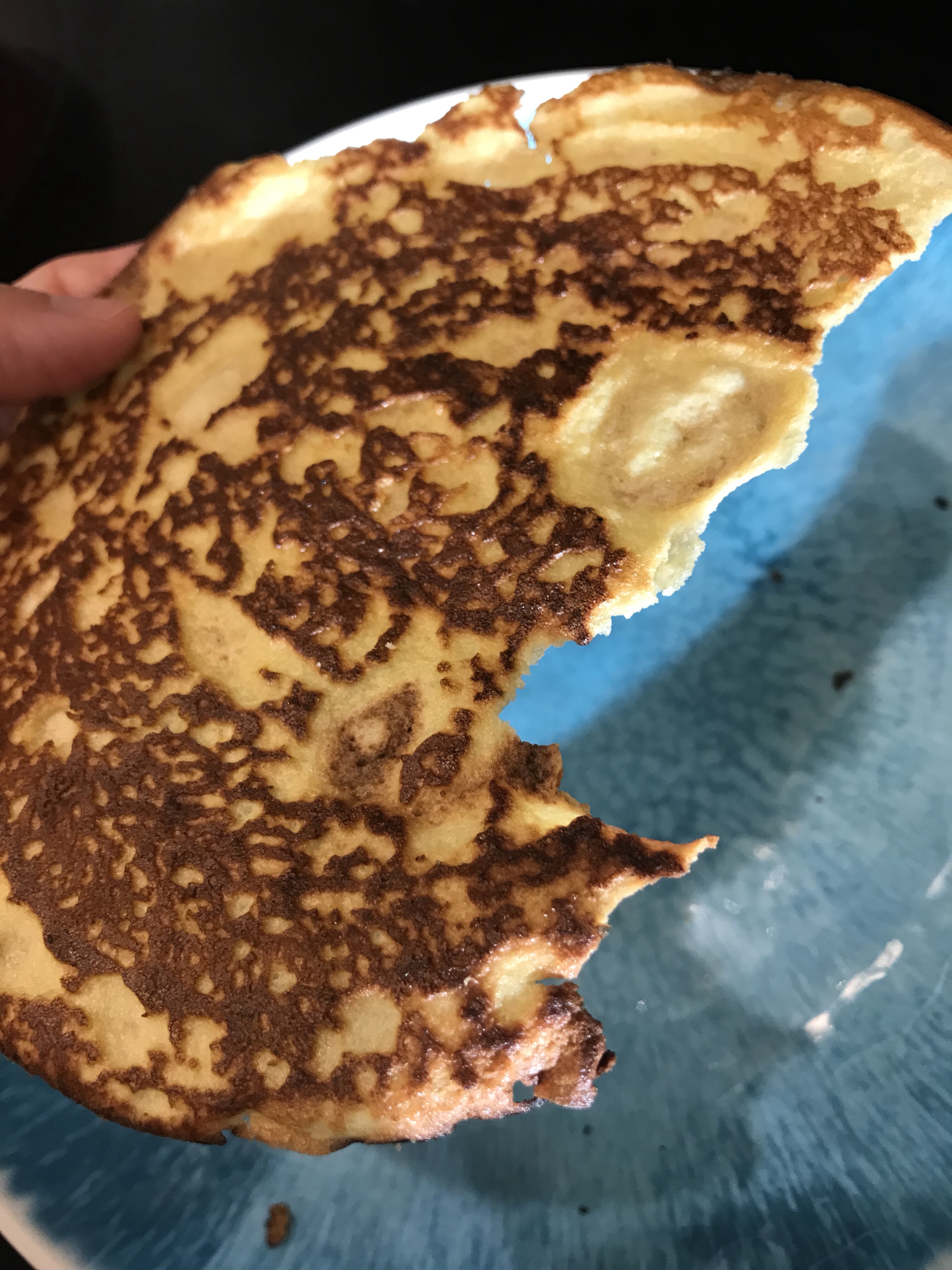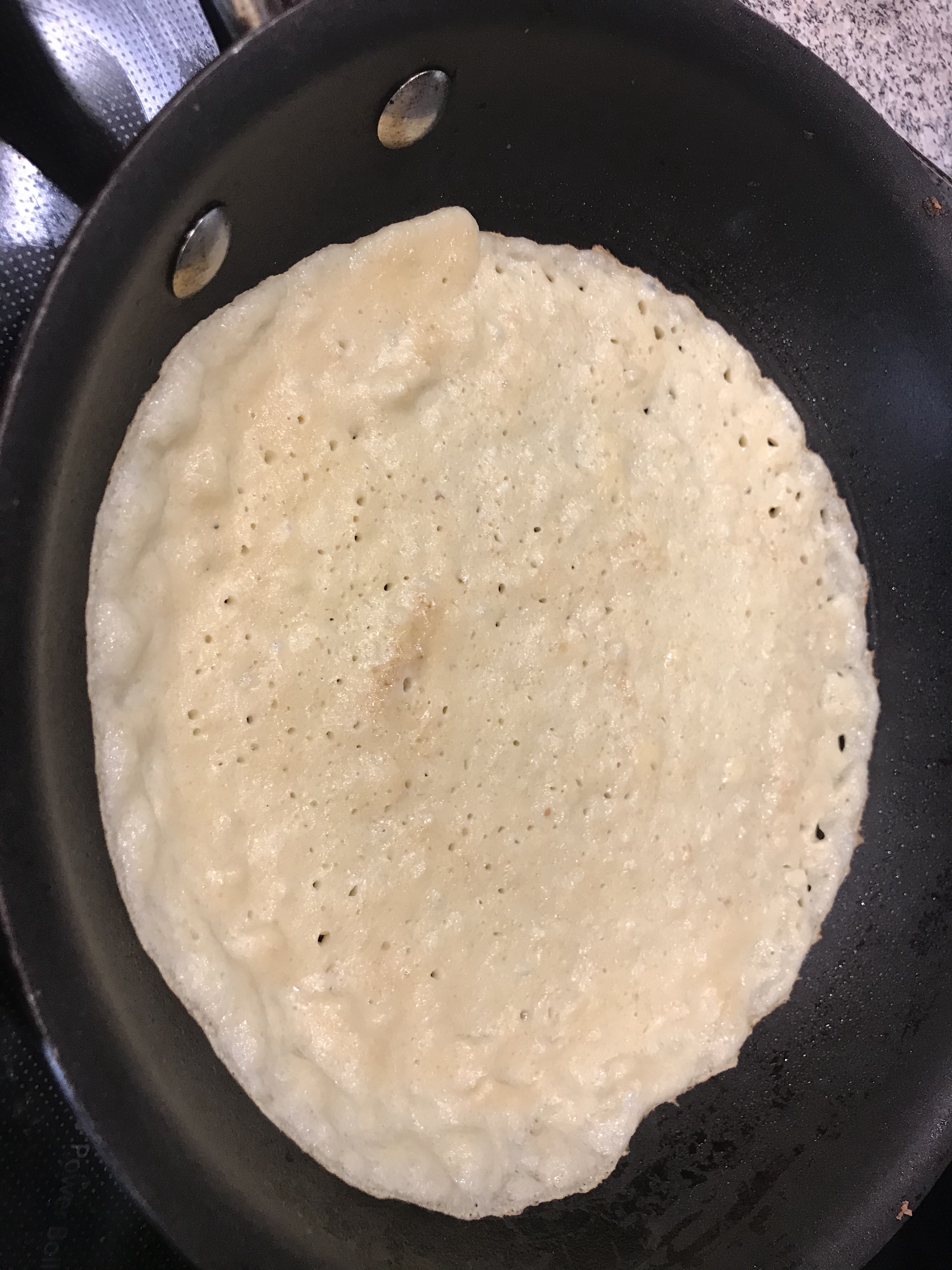Rociar el sartén con spray y poner 1/4 de taza de la mezcla, toma el sarten por el asa y le das vueltas de un lado a otro para que la mezcla se extienda por todo el sartén y queden bien delgaditas.