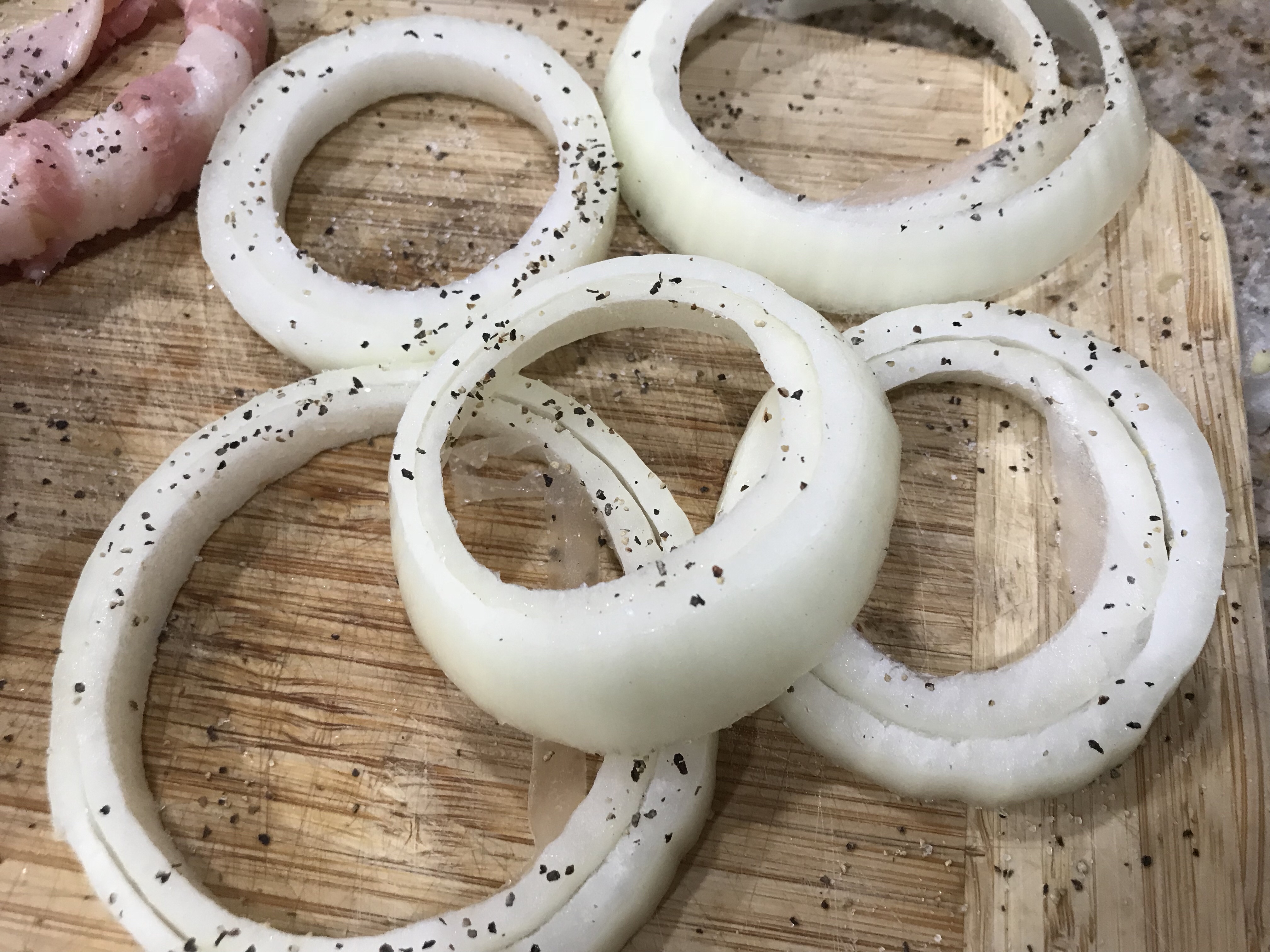 Cortar una cebolla en aros y reservar los aros más grandes, el resto, lo puedes utilizar para el pico de gallo que se sirve con la carne asada.