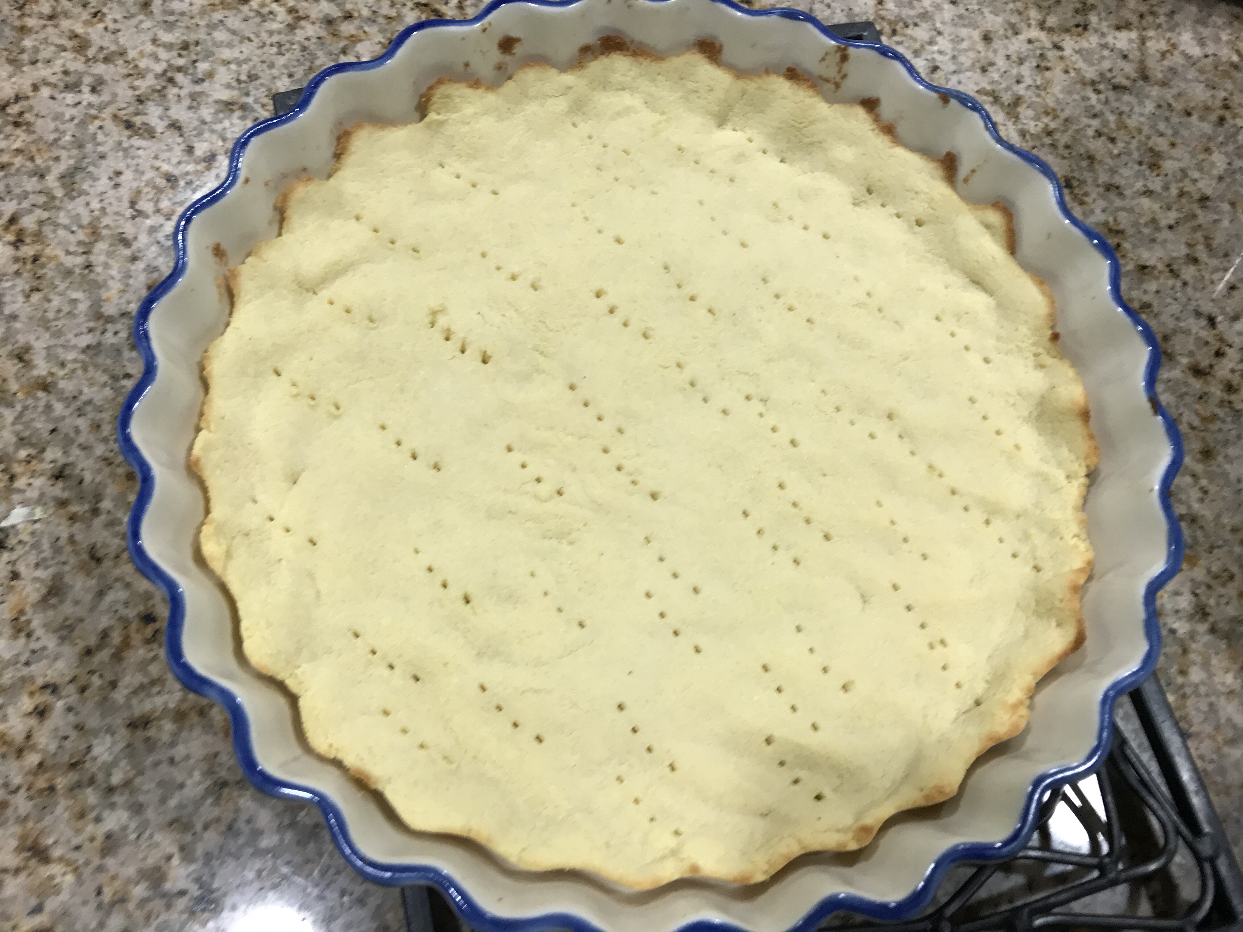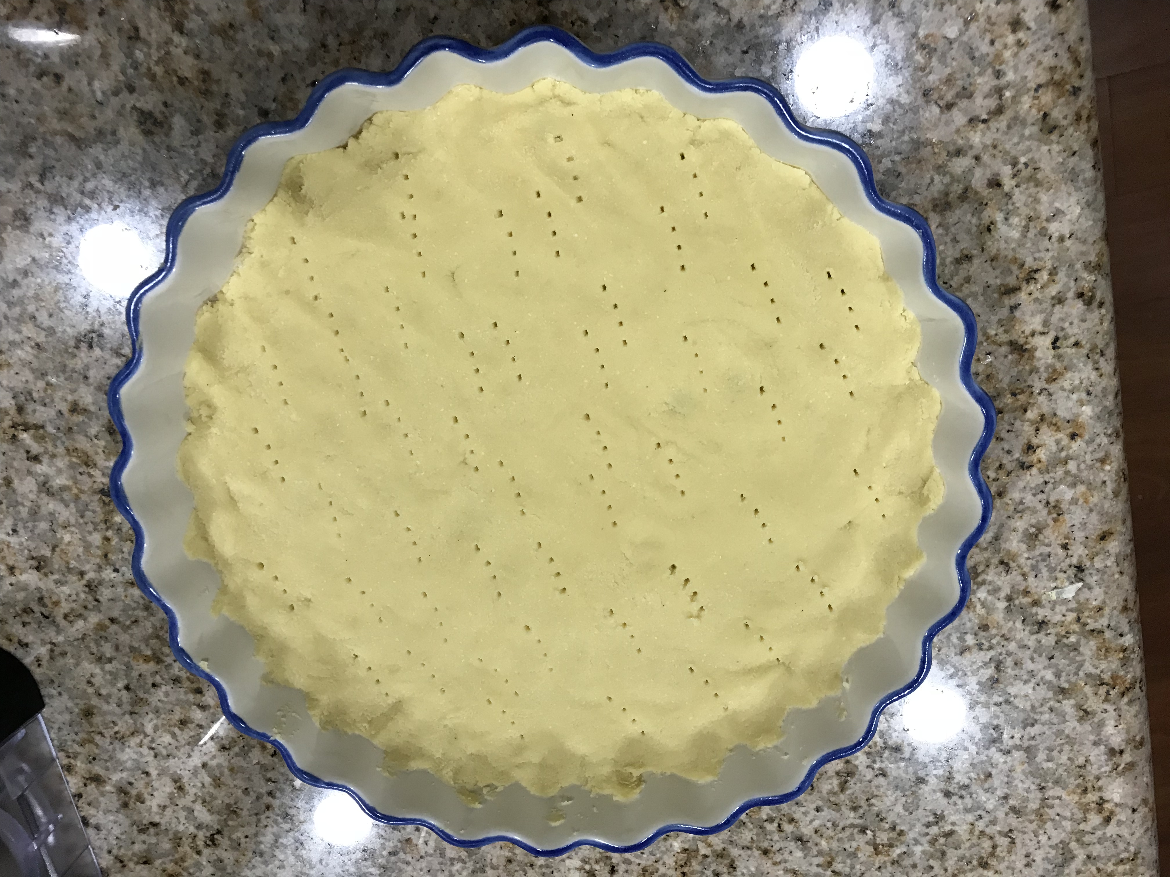 Moldea la masa según tu recipiente, yo decidí solo cubrir el fondo, pero después de hornear creo que pude hacerlo más delgado y cubrir el molde en su totalidad.