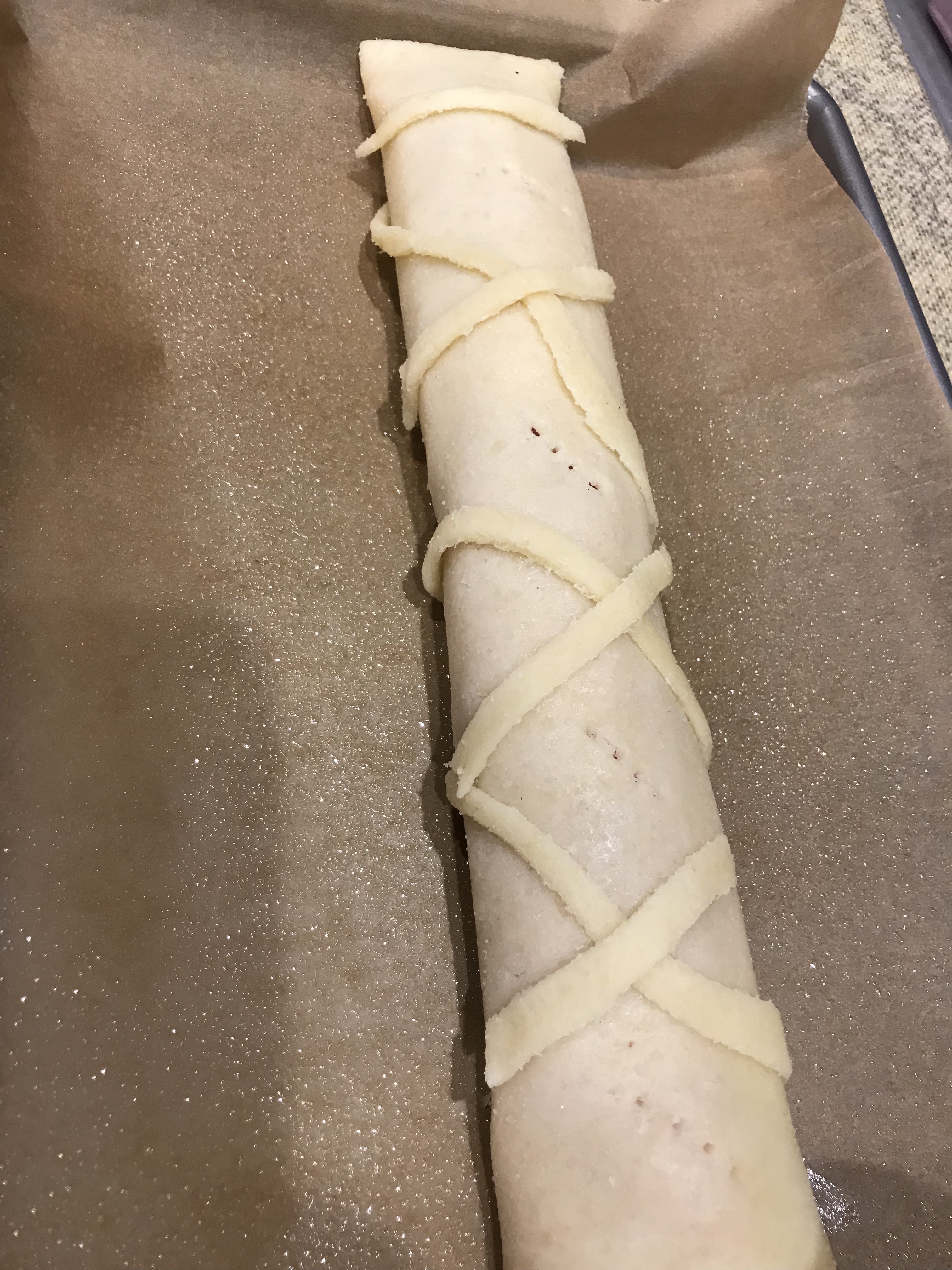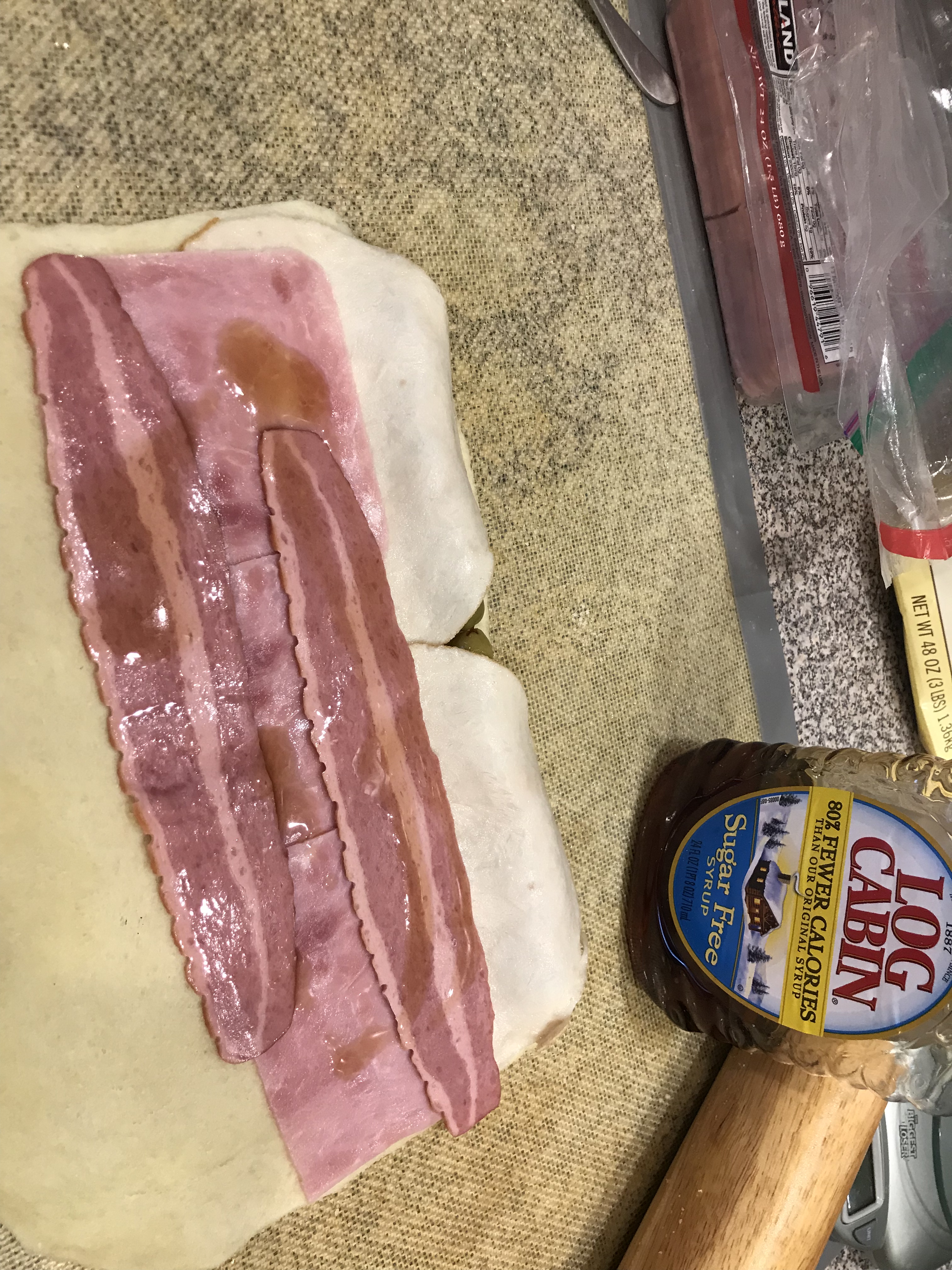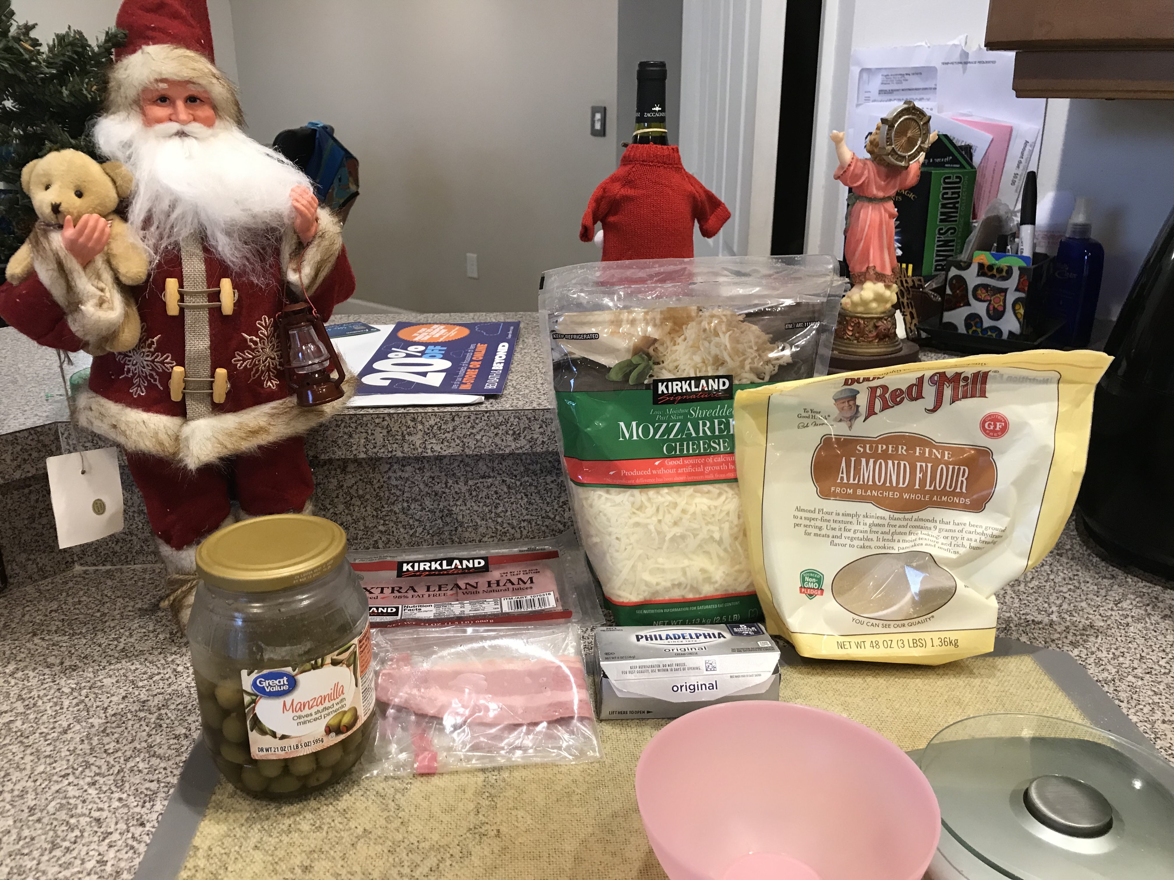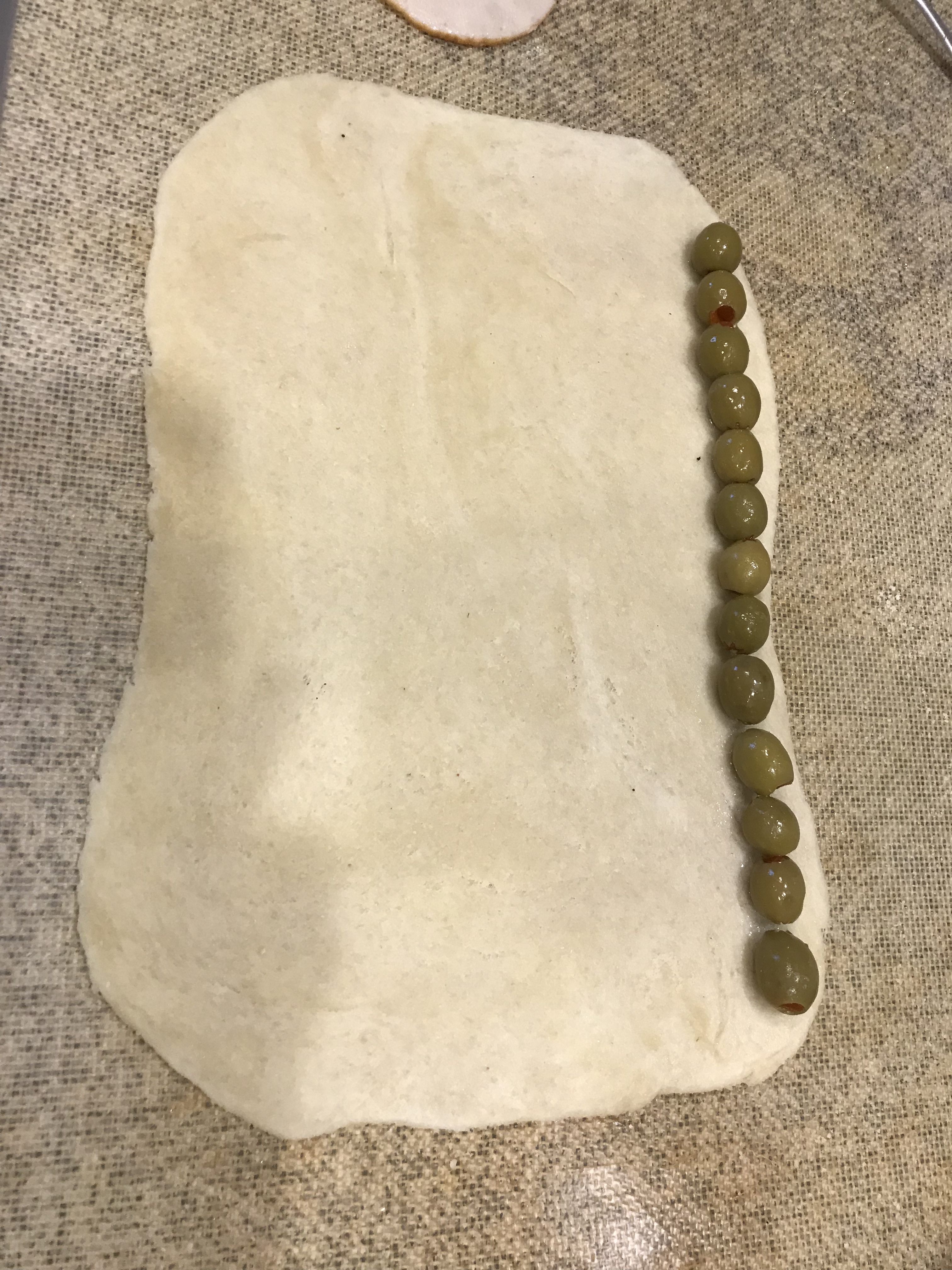 Coloco los 60 gr de queso mozzarella con el queso crema por 1 minuto en el microondas, revuelvo y agrego la harina de almendras, estiro la masa con un rodillo de amasar pan, procedo a ponerle el relleno primero las aceitunas y luego las cubro con el jamón le echo el syrup. Y procedo a enrollarlo, en la parte de abajo corto unas tiritas para adornar y le hago unos huequitos arriba con el tenedor. Horneo a 350 grados por 15-20 minutos. Si lo quieren mas grande dupliquen las cantidades