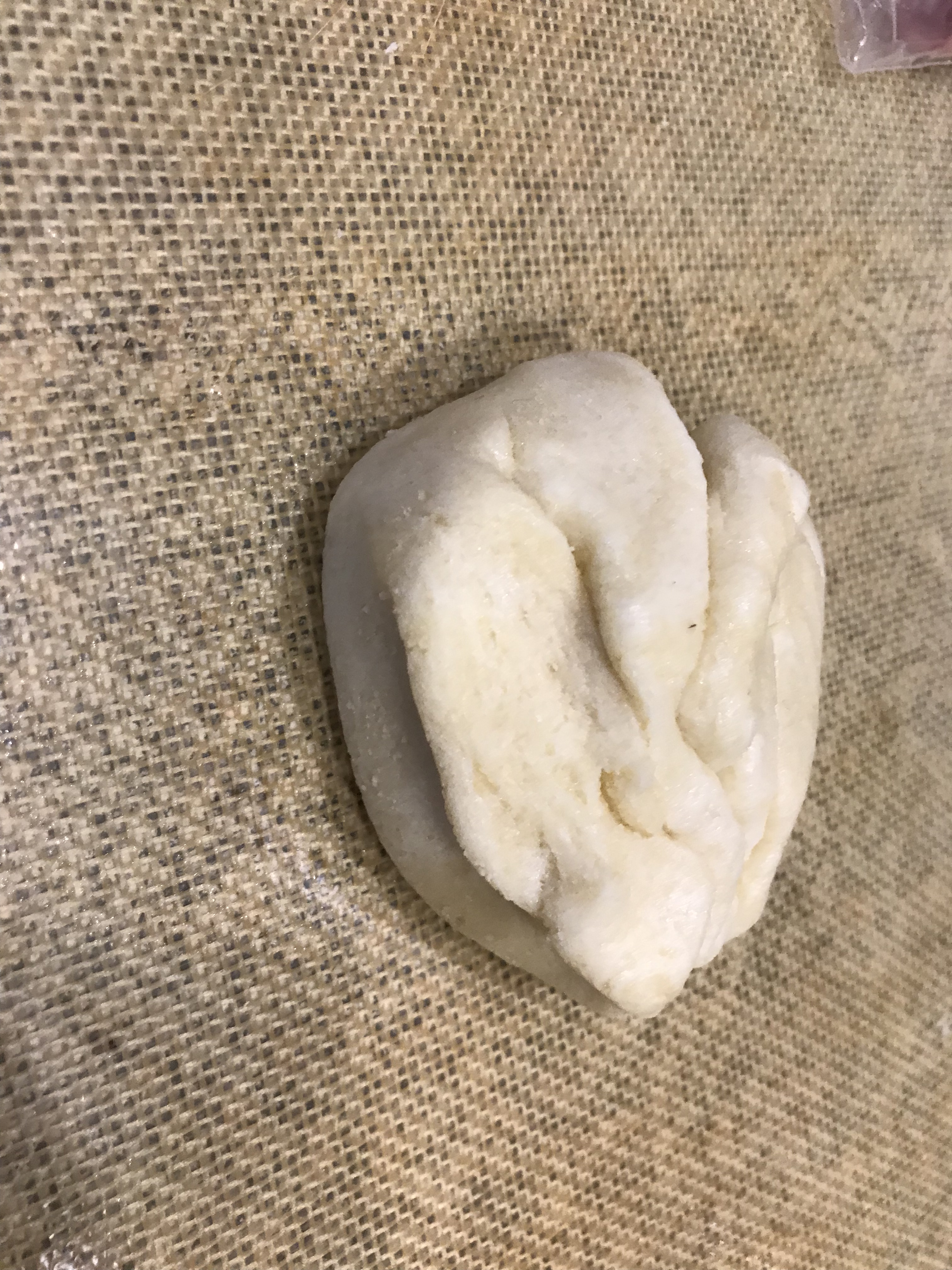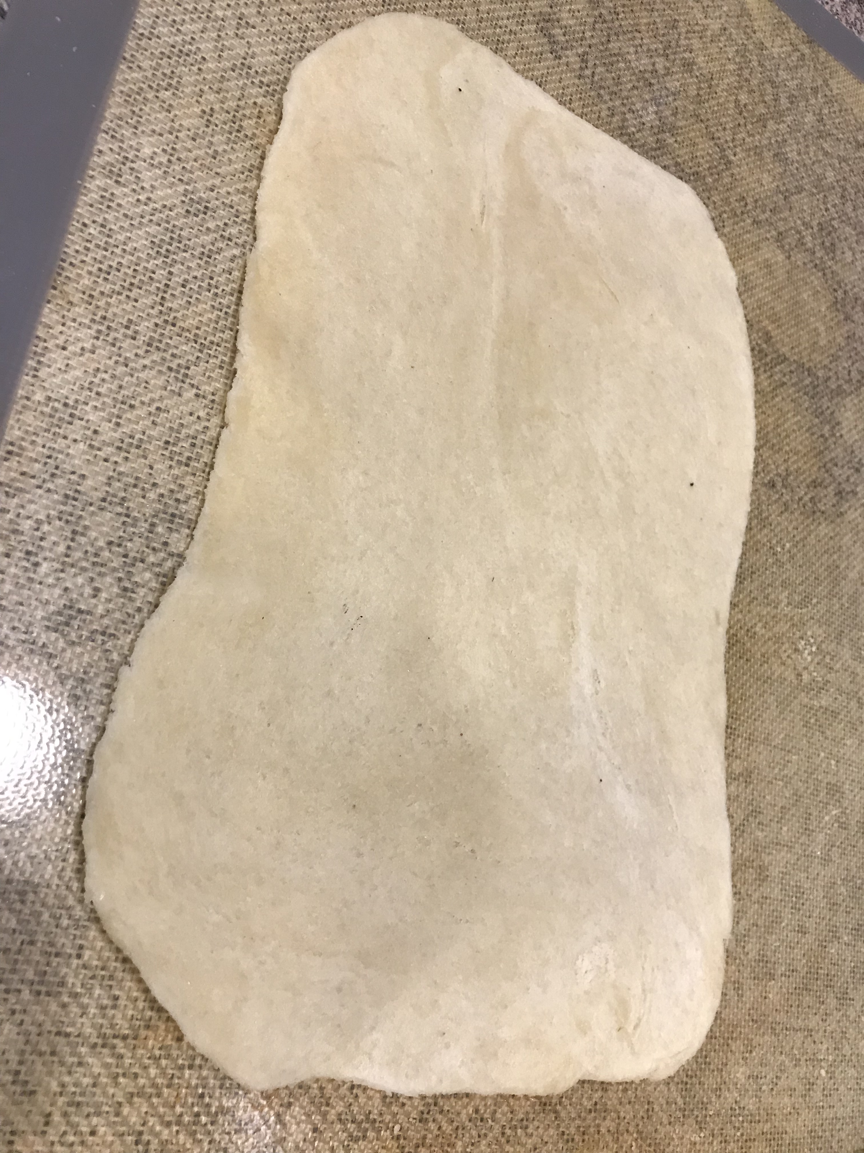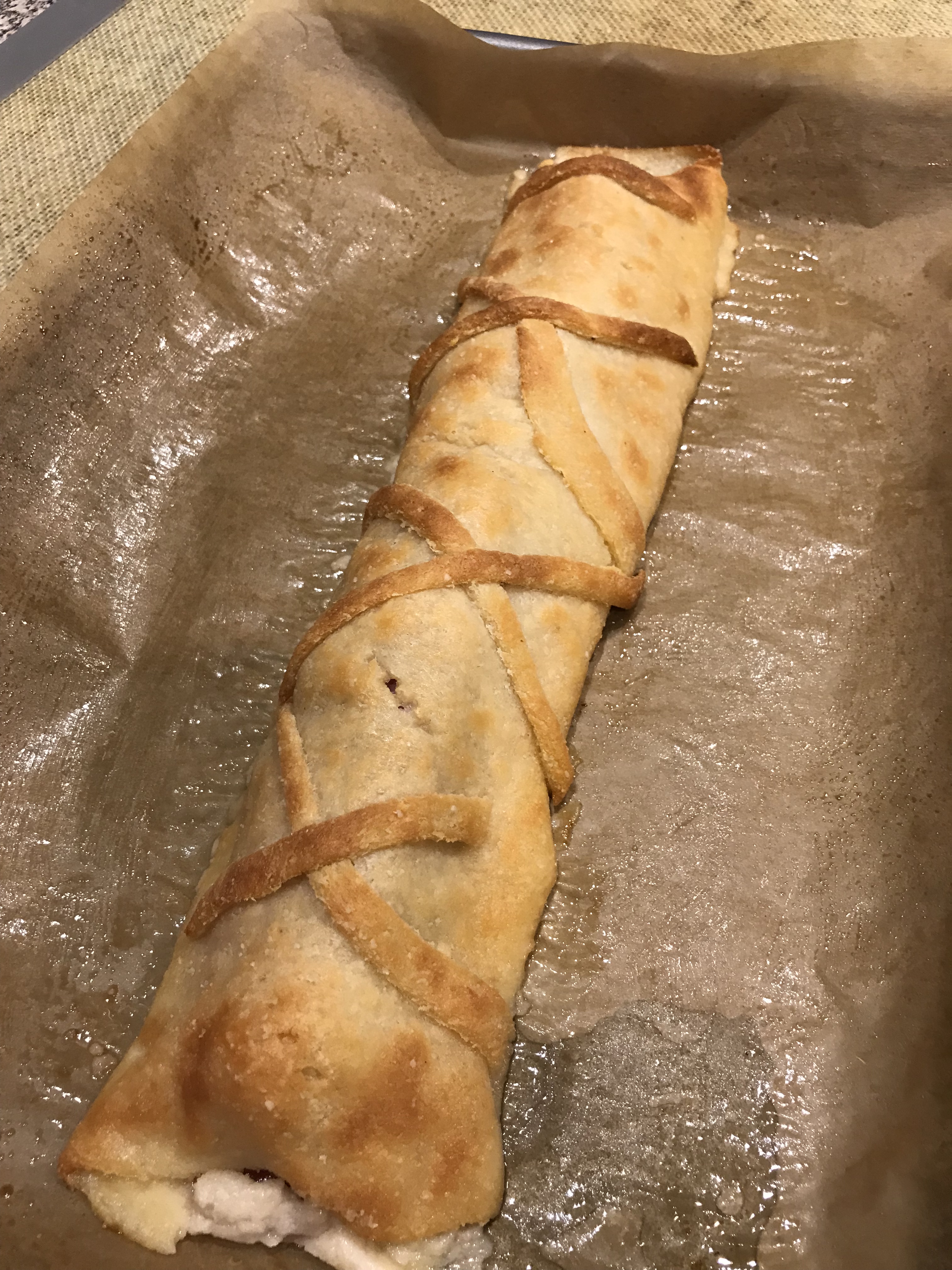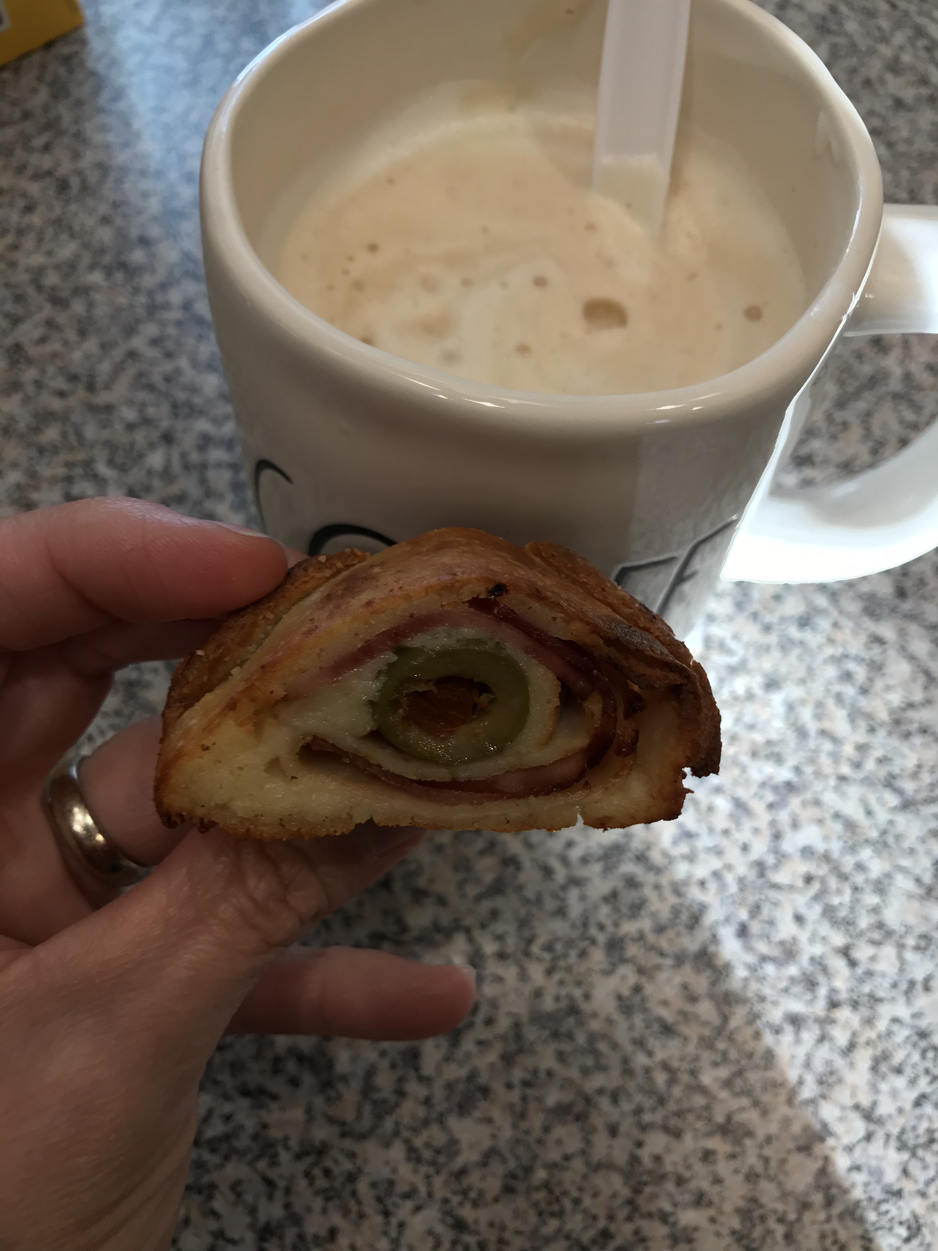 Coloco los 60 gr de queso mozzarella con el queso crema por 1 minuto en el microondas, revuelvo y agrego la harina de almendras, estiro la masa con un rodillo de amasar pan, procedo a ponerle el relleno primero las aceitunas y luego las cubro con el jamón le echo el syrup. Y procedo a enrollarlo, en la parte de abajo corto unas tiritas para adornar y le hago unos huequitos arriba con el tenedor. Horneo a 350 grados por 15-20 minutos. Si lo quieren mas grande dupliquen las cantidades