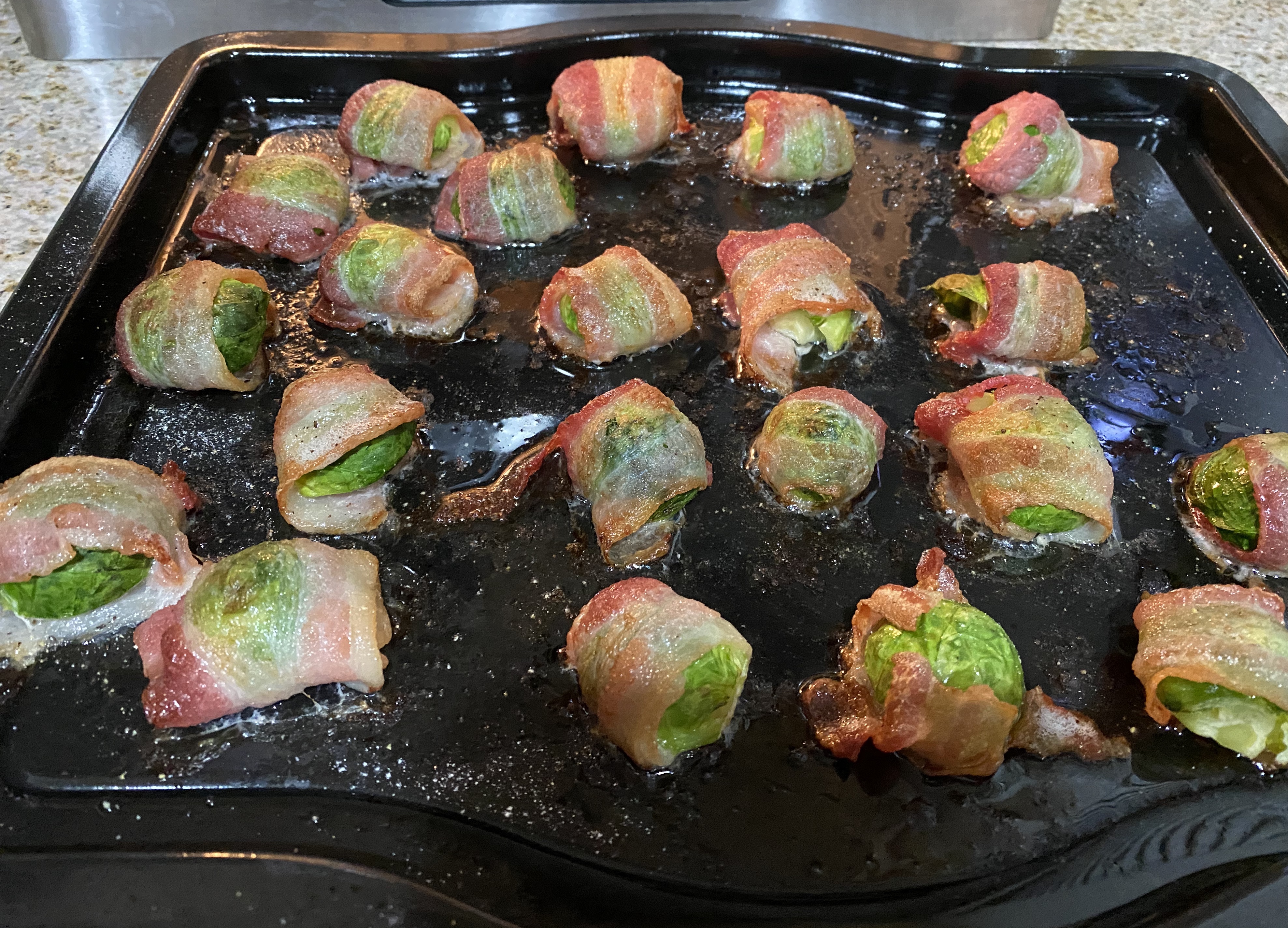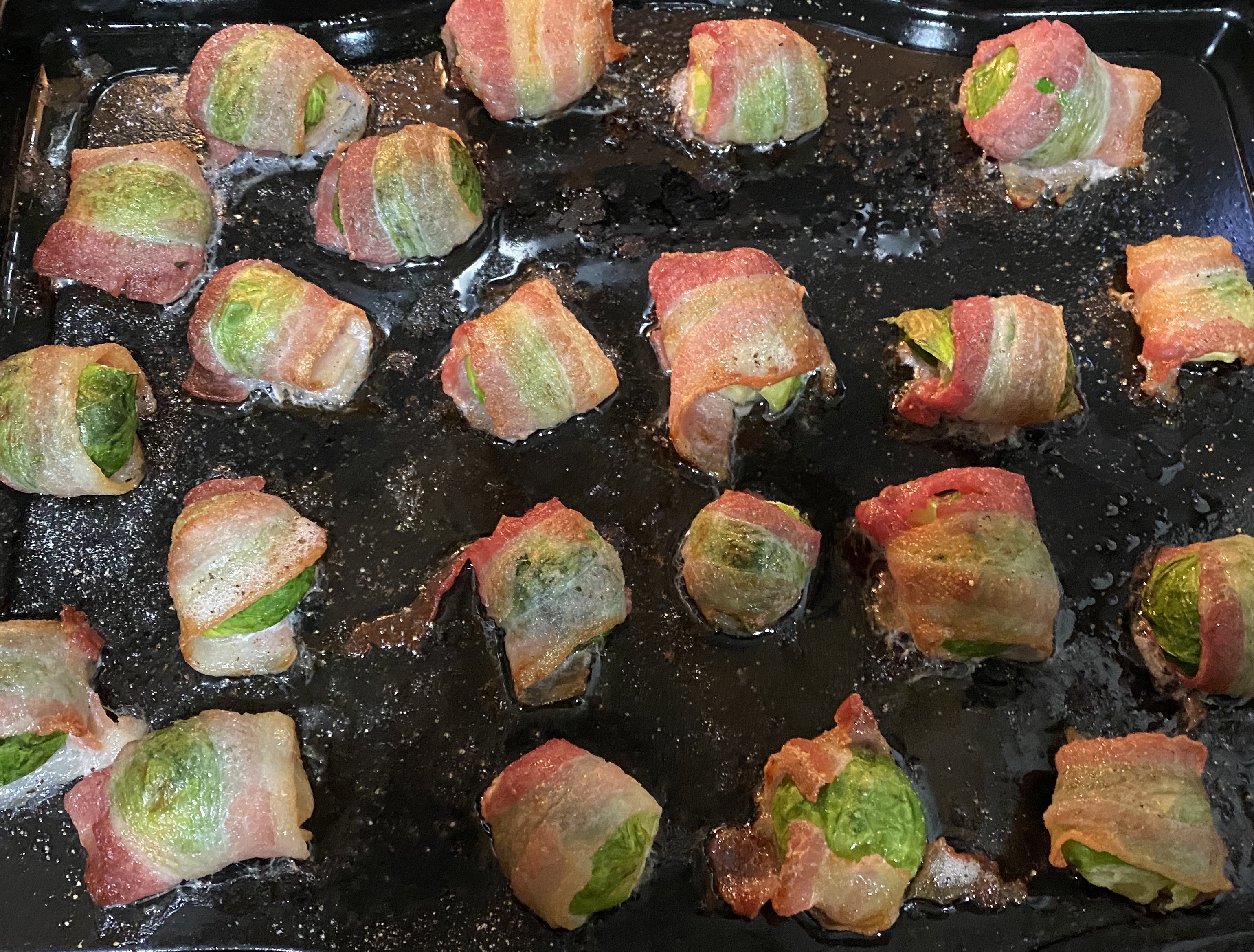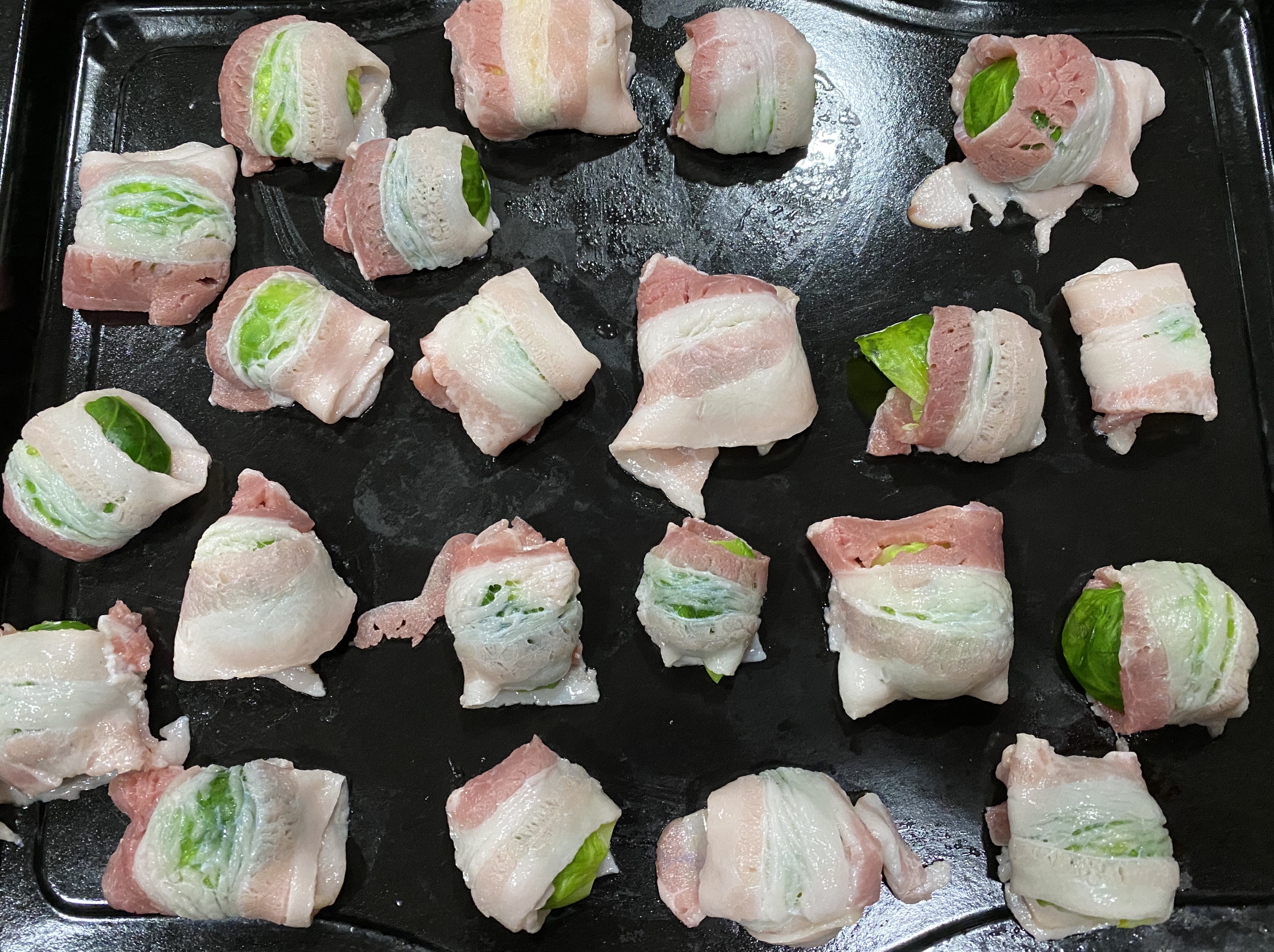 Coloca en charola y llévalos al horno 400f hasta lograr el dorado de el tocino según tu preferencia,