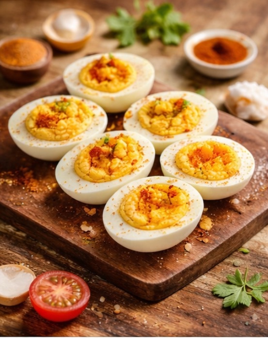 Corta los huevos a la mitad. Retira las yemas. Mézclalas con mayonesa, mostaza, sal y pimienta. Rellena las claras. Espolvorea paprika.