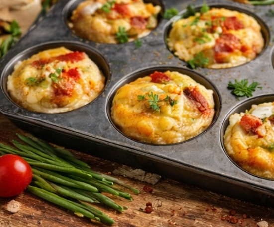 Precalienta horno a 180°C / 350°F. Bate los huevos. Agrega queso, tocino y pimiento. Vierte en moldes para muffin. Hornea 15–18 minutos.